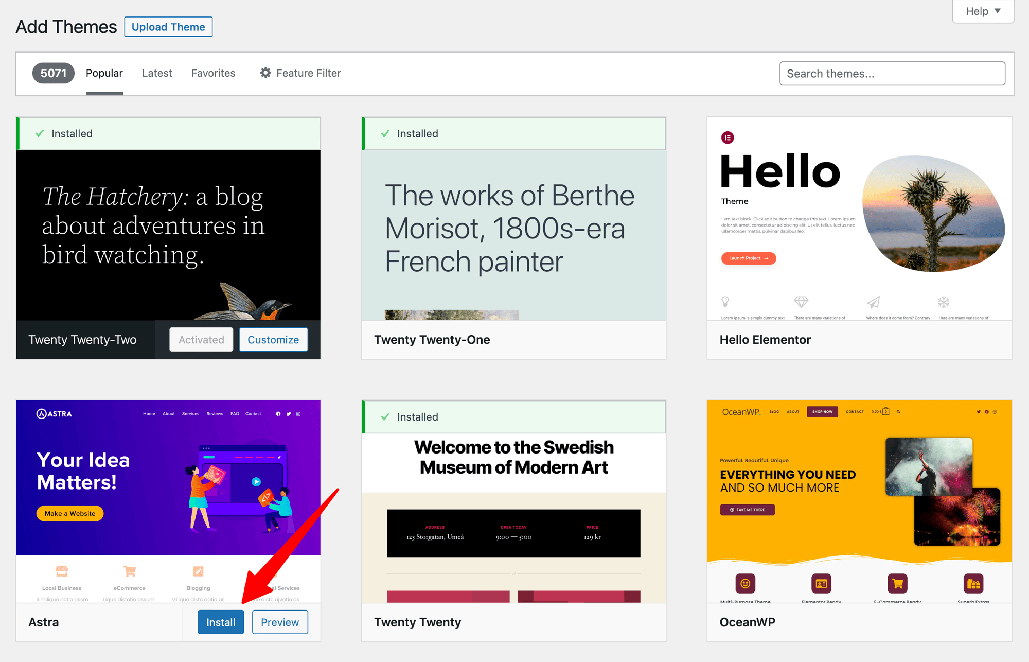 Under the list of recommendations, Astra should show up. Hover over it and click the Install button and then Activate.