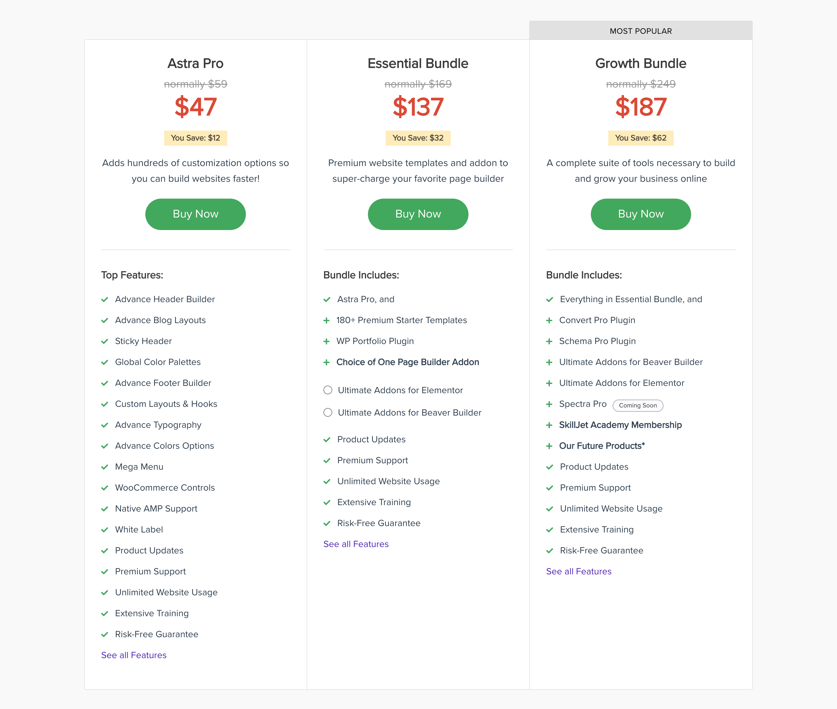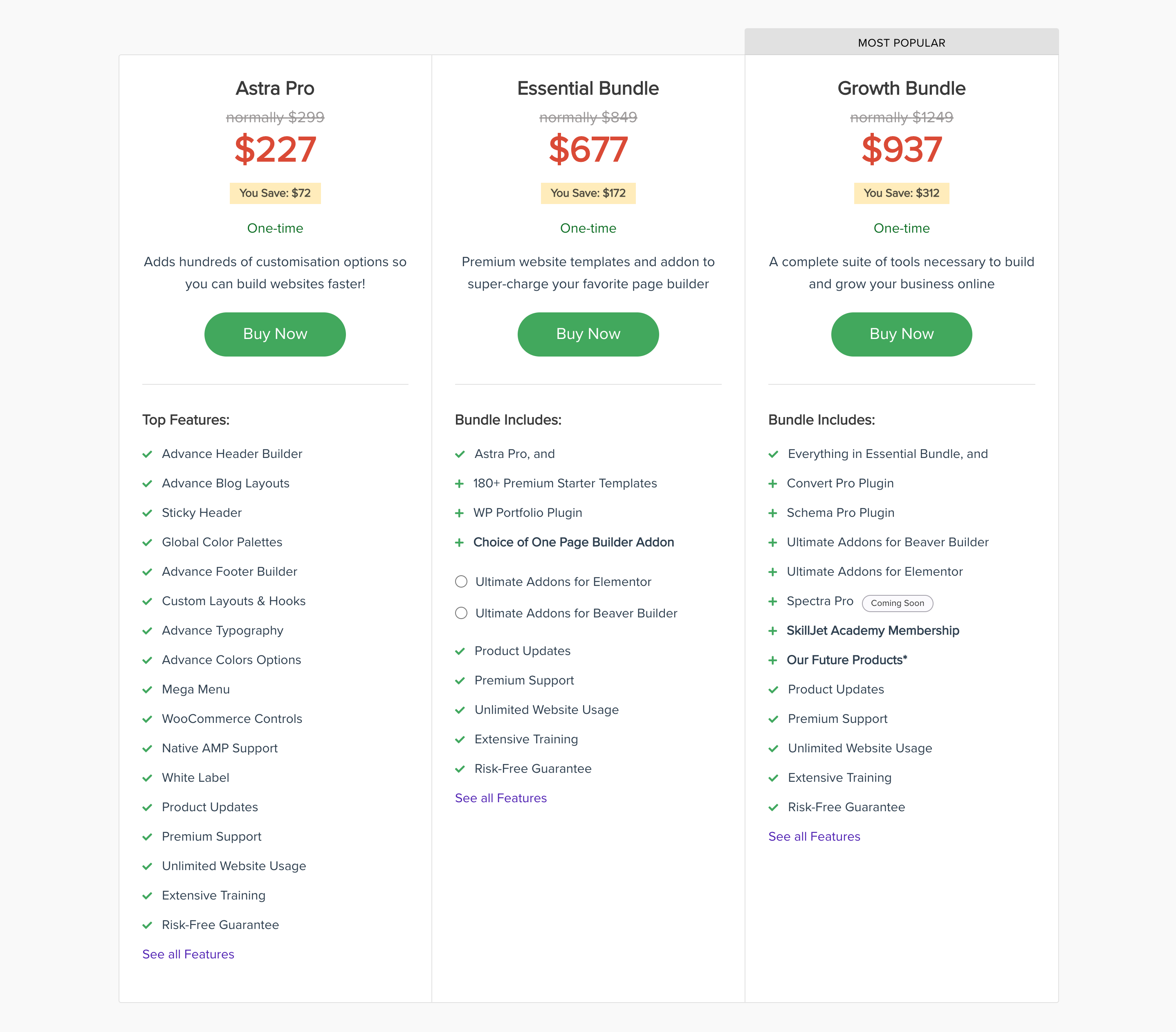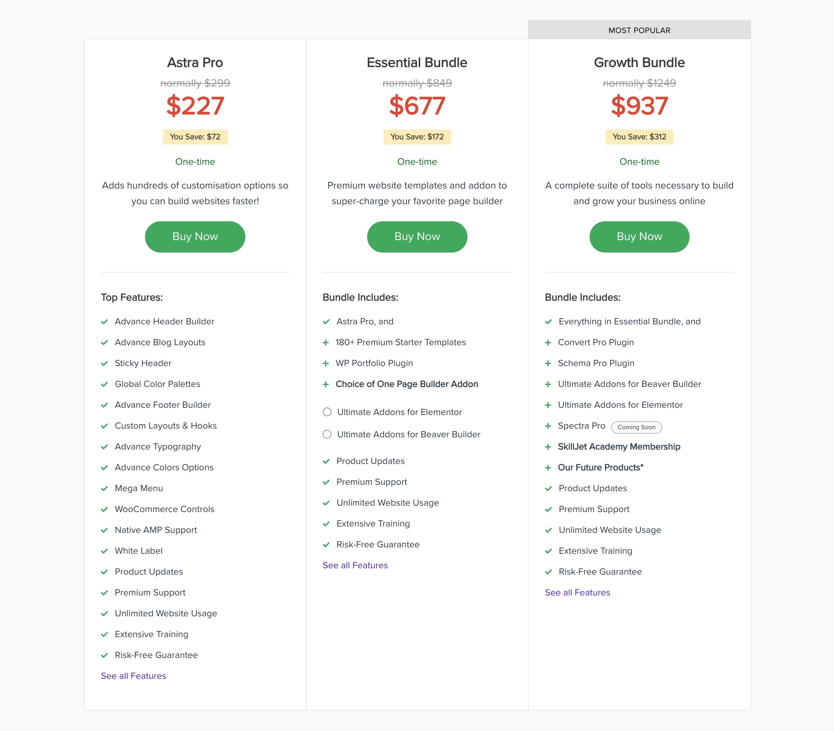 Finally, the Growth Bundle is the ultimate package for those looking to take their website to the next level. For $187 annually or a one-time fee of $937, you get all the features from the previous plans plus a WP Portfolio Plugin, Ultimate Addons for both Elementor and Beaver Builder, Convert Pro, and Schema Pro.